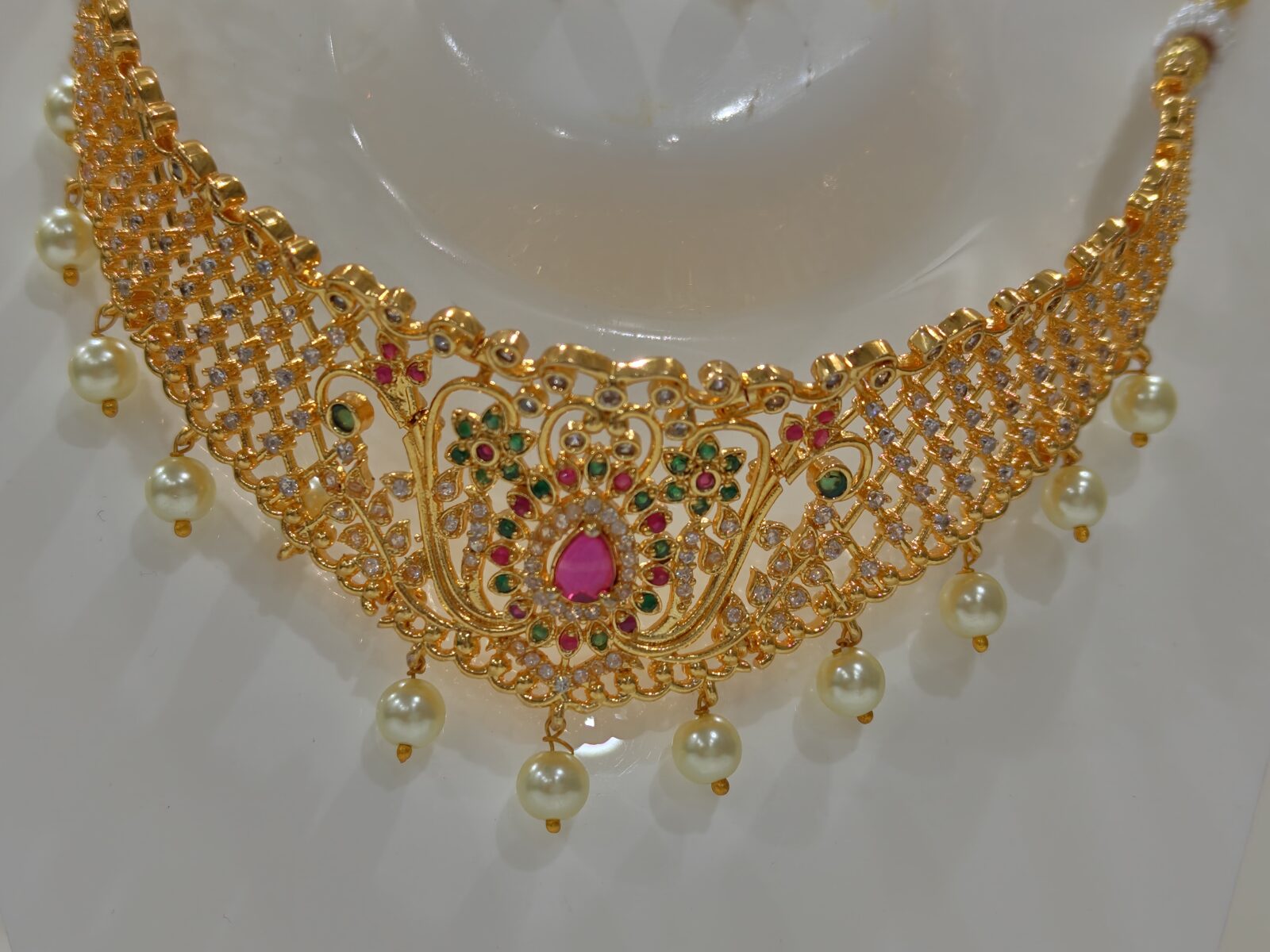 Exquisite Design : This stunning choker necklace features a luxurious gold-plated chain that sits gracefully around the neck, accentuated by elegant artificial pearls and small rubies.